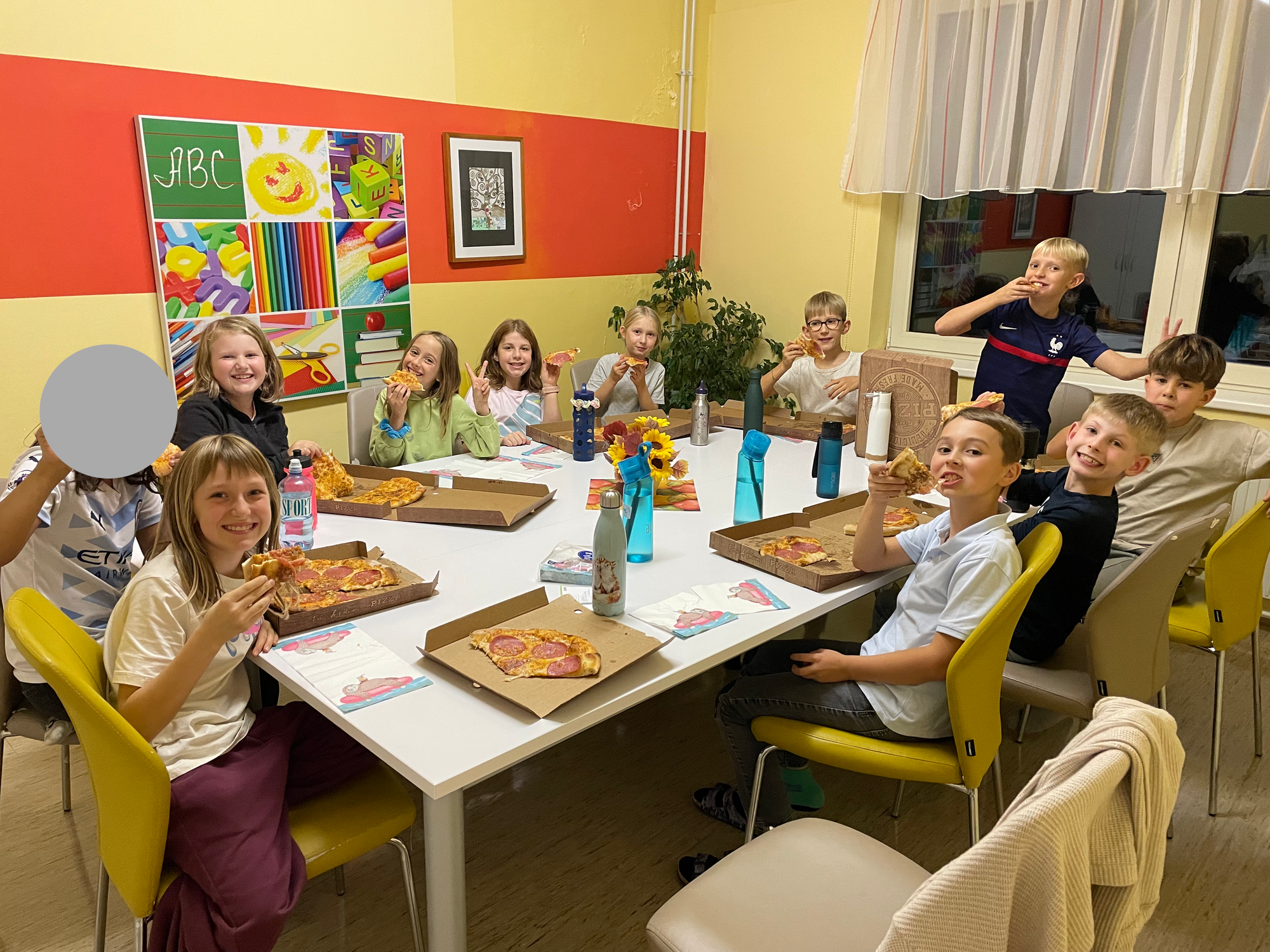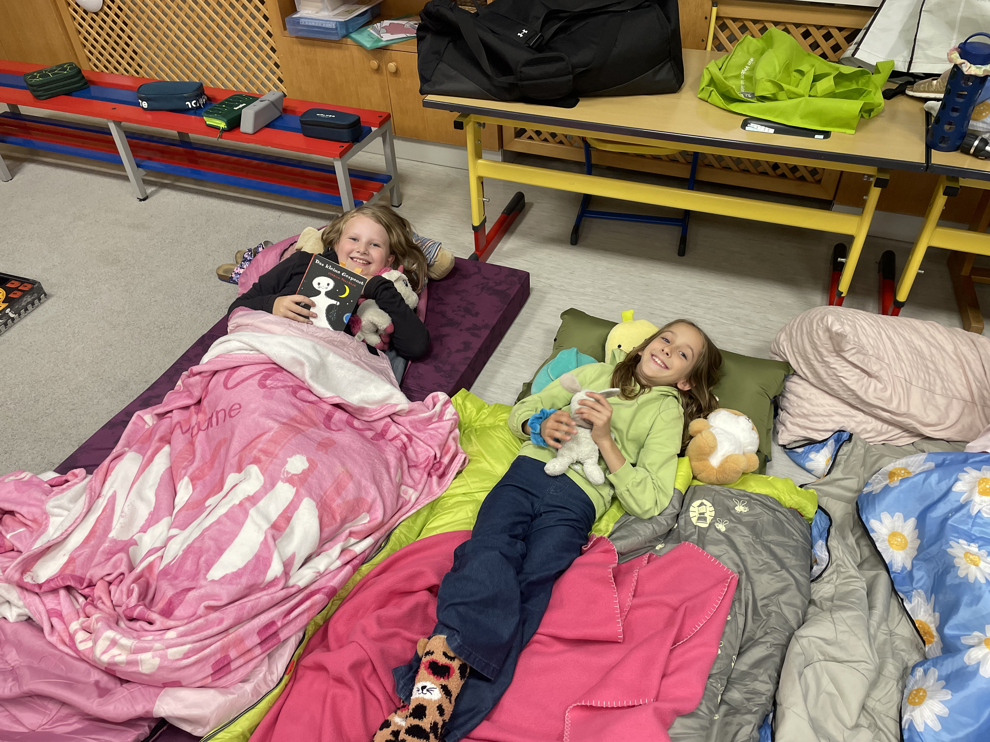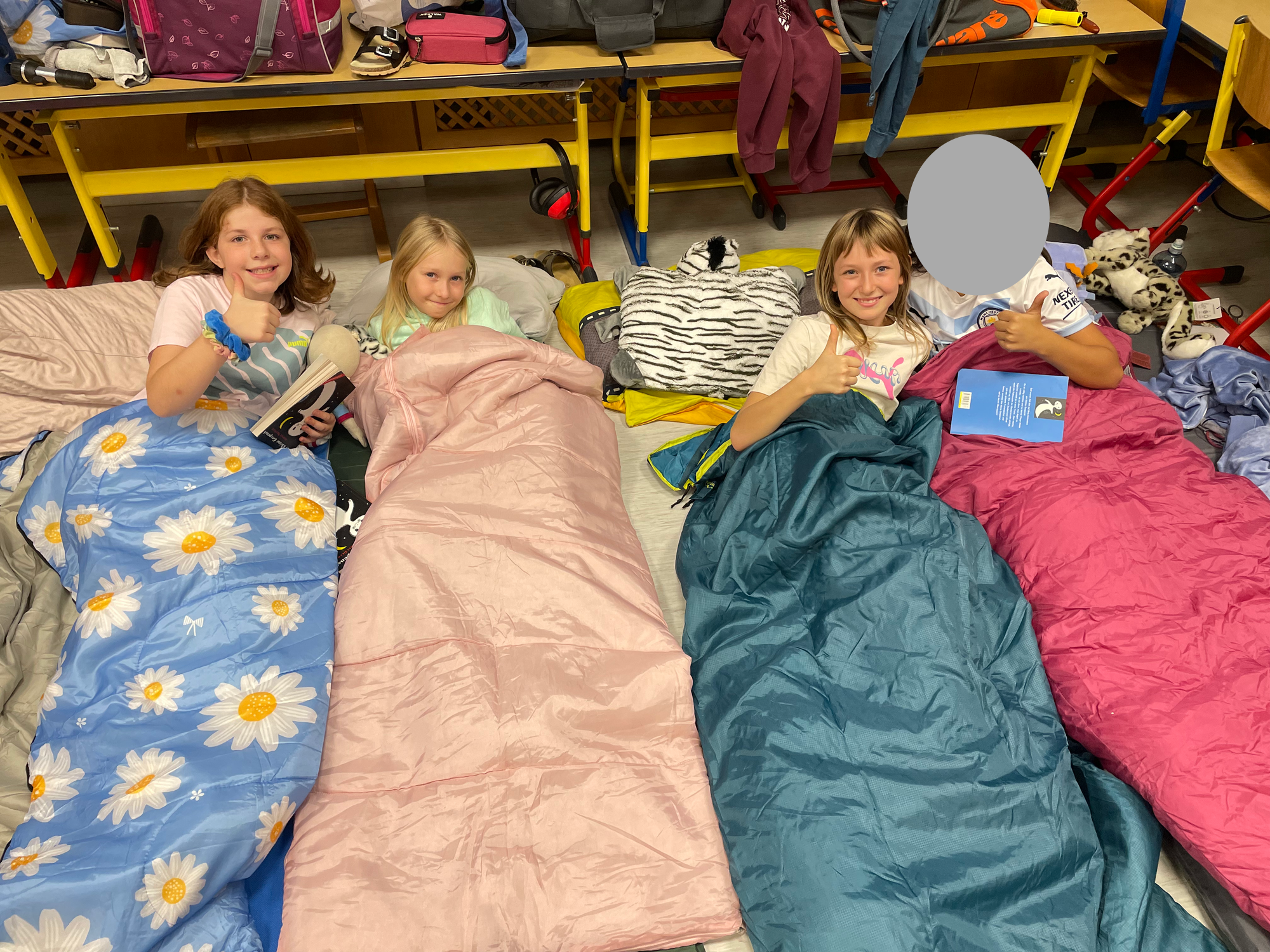 Zu Beginn machten es sich die Kinder gemütlich und lasen die letzten Kapitel des Buches. Anschließend warteten vielfältige Stationen zum Buch auf die Kinder. Diese wurden mit großem Eifer bearbeitet. Zwischenzeitlich stärkten wir uns beim gemeinsamen Abendessen mit einer Pizza. Ein echtes Highlight stellte das späte Versteckspiel im dunklen Schulhaus dar. Mit Taschenlampen ausgestattet fühlten sich die Kinder wie das Nachtgespenst in der gelesenen Geschichte. Den krönenden Abschluss bildete die Kinderdisco im Turnsaal, bei welcher getanzt und gelacht wurde. Später, in den Schlafsäcken eingewickelt, lasen die Kinder noch leise in einem selbstgewählten Buch, bis nach und nach Ruhe einkehrte.